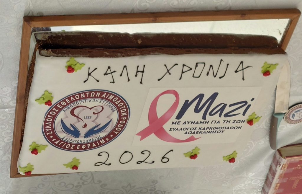 Σε μια εκδήλωση βαθιά ανθρώπινη, φορτισμένη με συναίσθημα, ελπίδα και ουσιαστικά μηνύματα ζωής, πραγματοποιήθηκε σήμερα στο Γενικό Νοσοκομείο Ρόδου η αδελφοποίηση του Συλλόγου Στήριξης Καρκινοπαθών Δωδεκανήσου «Μαζί με δύναμη για τη ζωή» με τον Σύλλογο Εθελοντών Αιμοδοτών Ρόδου «Άγιος Εφραίμ», παράλληλα με την κοπή της πρωτοχρονιάτικης βασιλόπιτας των δύο συλλόγων.